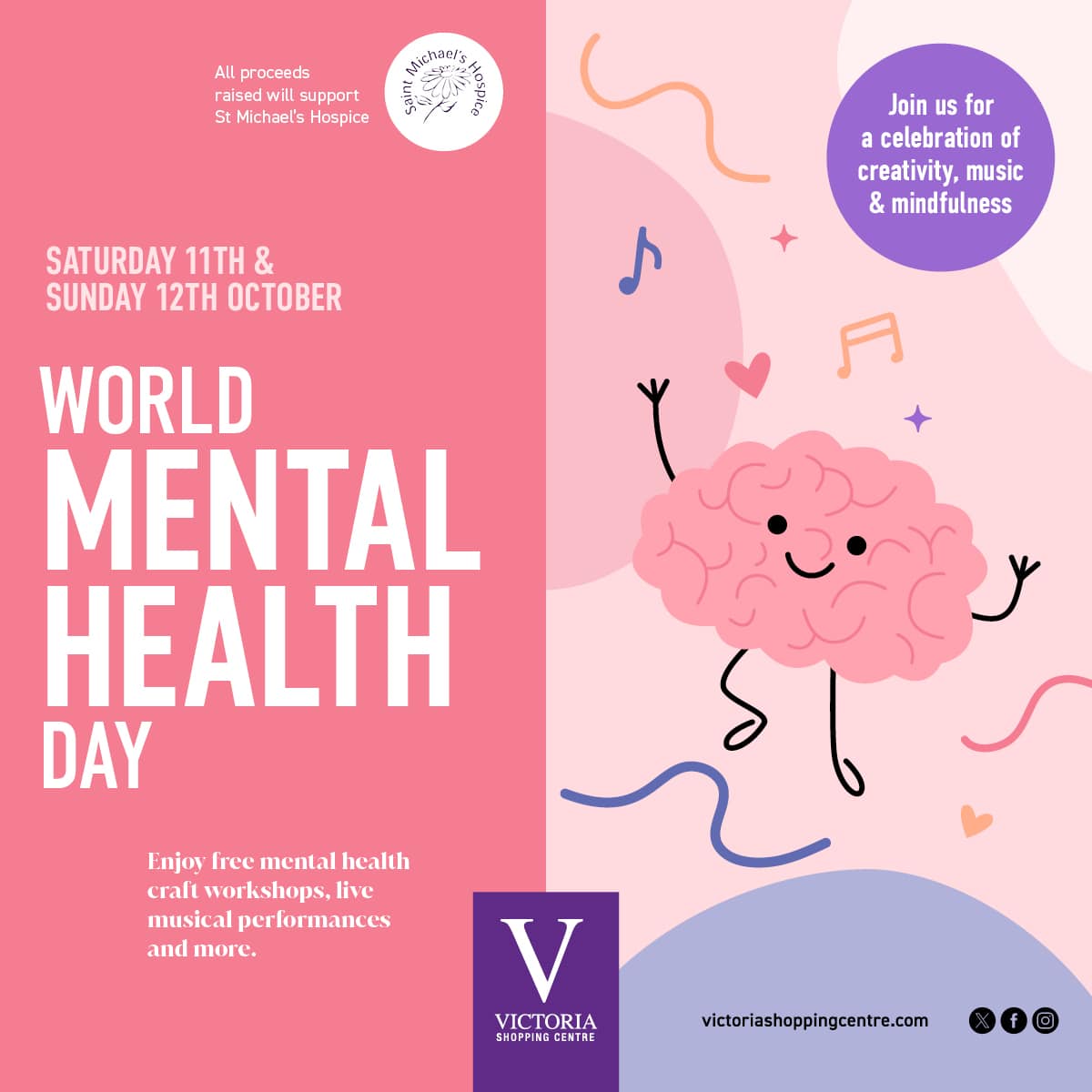 Join us on Saturday 11th and Sunday 12th October from 11am – 3pm for FREE positive mental wellbeing craft sessions, live musical performances and more, all in recognition of World Mental Health Day. Activity will be offered free, however, donations will be gratefully accepted by St Michael’s Hospice.